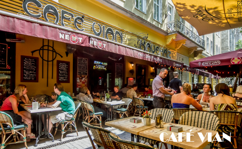 It’s not just Café Vian’s location on the sunny side of the street that makes it one of our favourites on the Tér. A whole week can be spent over a coffee or cocktails enjoyed outside under the shade of a verandah, or in the spacious interior with its comfortable, loungey interior. The menu of wholesome pastas and salads is better than you might have had any right to suspect. The framed paintings on the wall look like they were salvaged from an early 1980s fashion and design school. Maybe it’s all coming back – said paintings are also for sale.