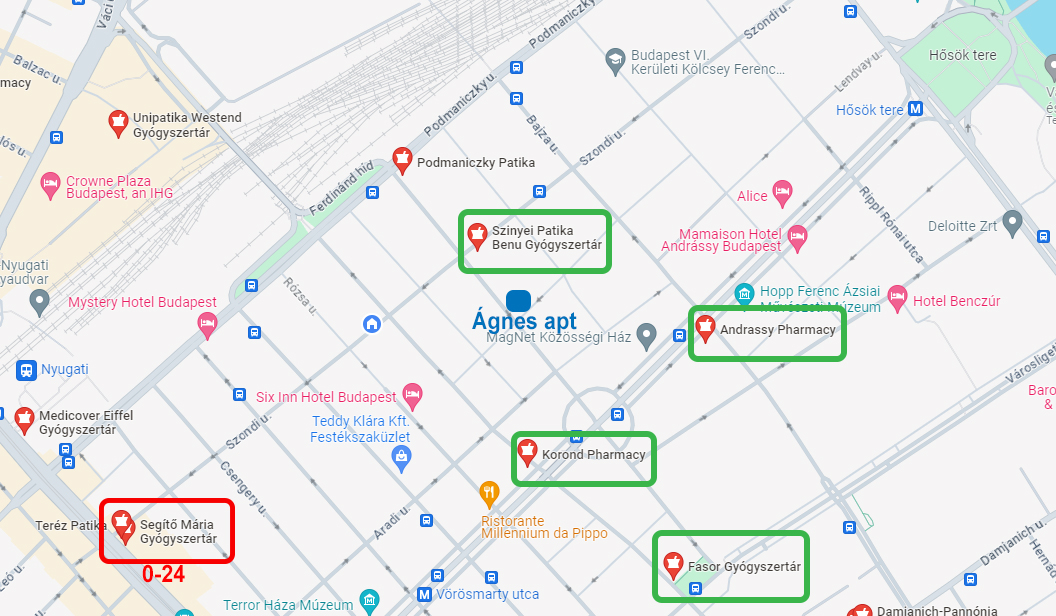 The attached picture shows a list of pharmacies in the area. The pharmacies in the green frame are open Monday to Saturday (normal opening hours), the pharmacy in the red frame is open 0-24.